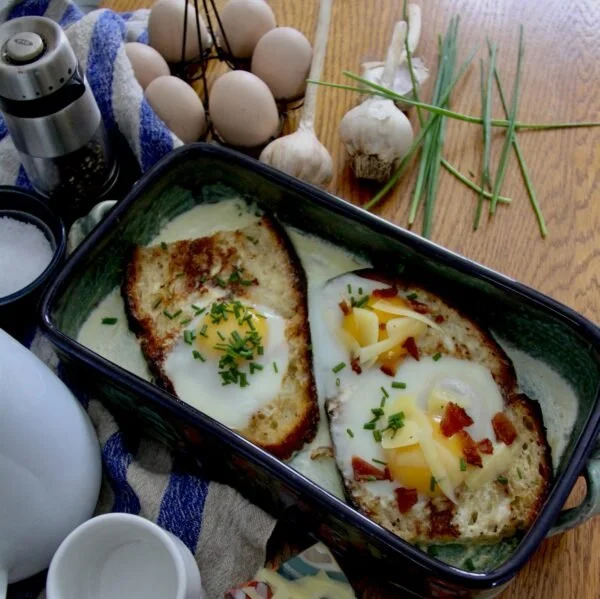 One of my favorite ways to enjoy eggs is oeufs au plat Bressanne, baked toast with cream and eggs. Bread slathered with butter is gently sauteed until golden brown, then covered in warm cream, garlic, and herbs. Topped with an egg, each serving is then baked to perfection. Sprinkle some chopped bacon and maybe a dash of shredded cheese over the top if you like. Served with a green salad and some chilled rose wine, it’s just about as good as it gets.
