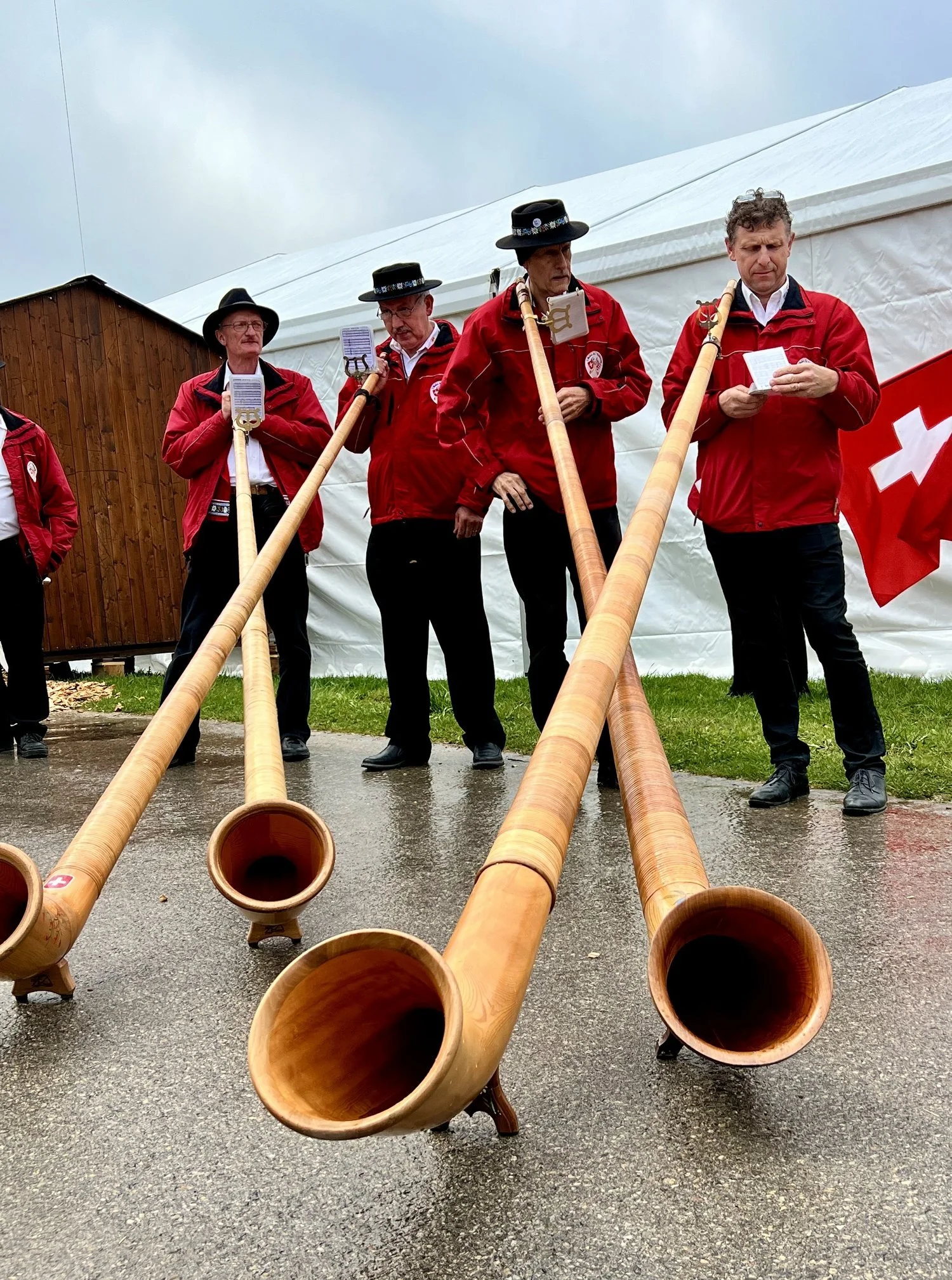 Throughout the day, demonstrations and presentations are open for people to enjoy. Photo and art exhibits are presented in a tented gallery. Cow farmers demonstrate how to milk animals. Master cheesemakers in the Maison show guests how Tête de Moine was originally made, using copper cauldrons and open fire to create wheels that will age in the cellars below. Every hour, a group of Alpenhorn players gather to perform. Their ten-foot long horns produce rich, sonorous melodies that can be heard for miles, the traditional purpose of the gigantic instrument.